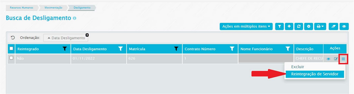 Selecione a matrícula e clique em Reintegração de Servidor, que fica na coluna de Ações /> Mais Opções:
