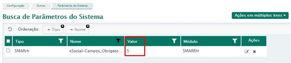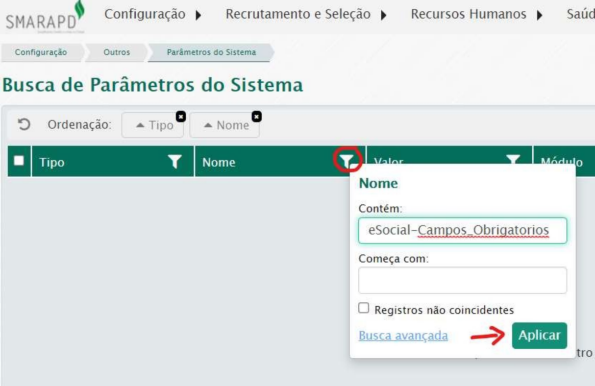 No filtro, preencher o campo NOME com “eSocial-Campos_Obrigatorios” (sem as aspas) e clicar em Aplicar. Edite, se necessário – o campo VALOR deve estar com S (sim):