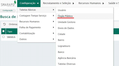 Navegar pelo Menu Configuração \> Tabelas Básicas \> Órgão Público.
