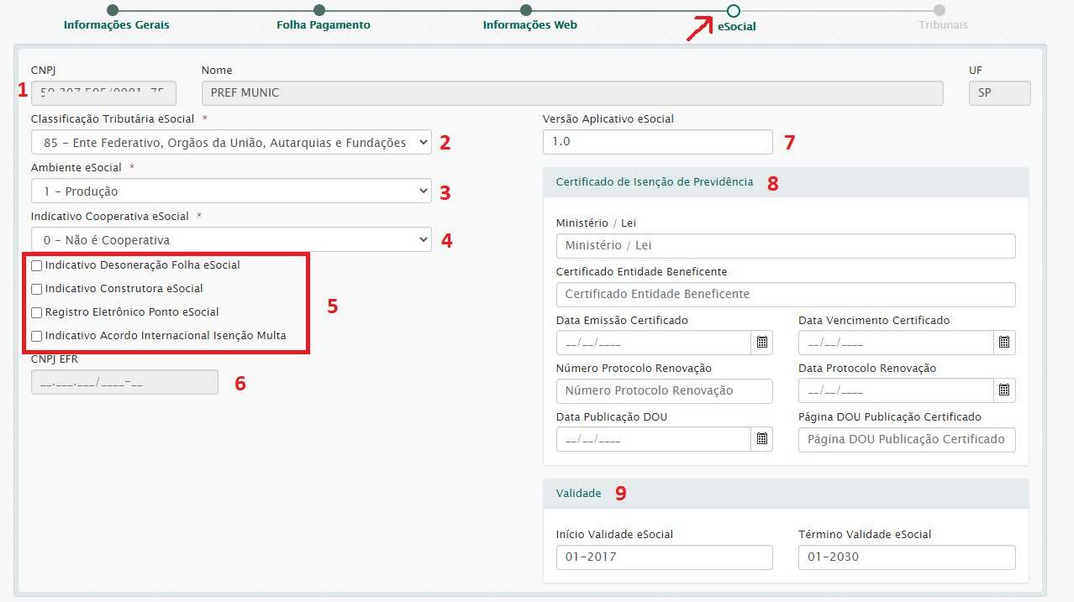 1-Empregador – o sistema já busca a configuração do cliente, com o CNPJ do órgão (Prefeitura, Câmara, DAE, SAE, Fundação, etc).