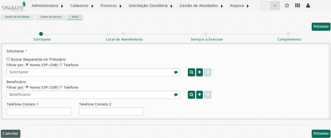 Primeiramente serão solicitados os dados do solicitante e do beneficiário do processo.
