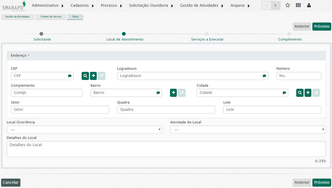 Preencha com o máximo de dados possíveis o local de atendimento.