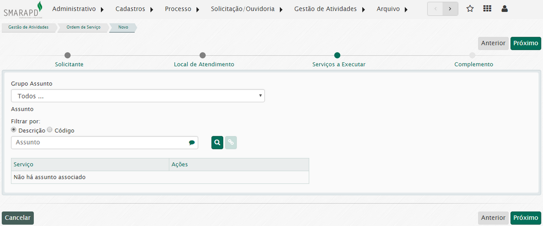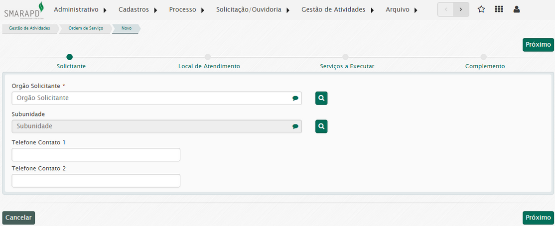 A abertura de Ordens de Serviço é dividida em passos. Para cada tipo de abertura os campos e os passos serão diferentes.