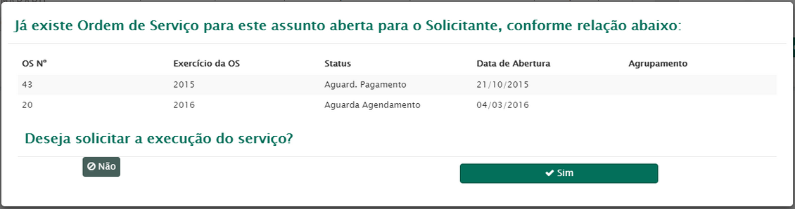 Caso exista alguma ordem de serviço aberta em nome do solicitante para o assunto selecionado será exibida a seguinte mensagem: