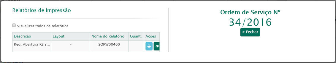 Ao terminar o registro da ordem de serviço, serão exibidos os relatórios para impressão como, por exemplo, o Requerimento de abertura.