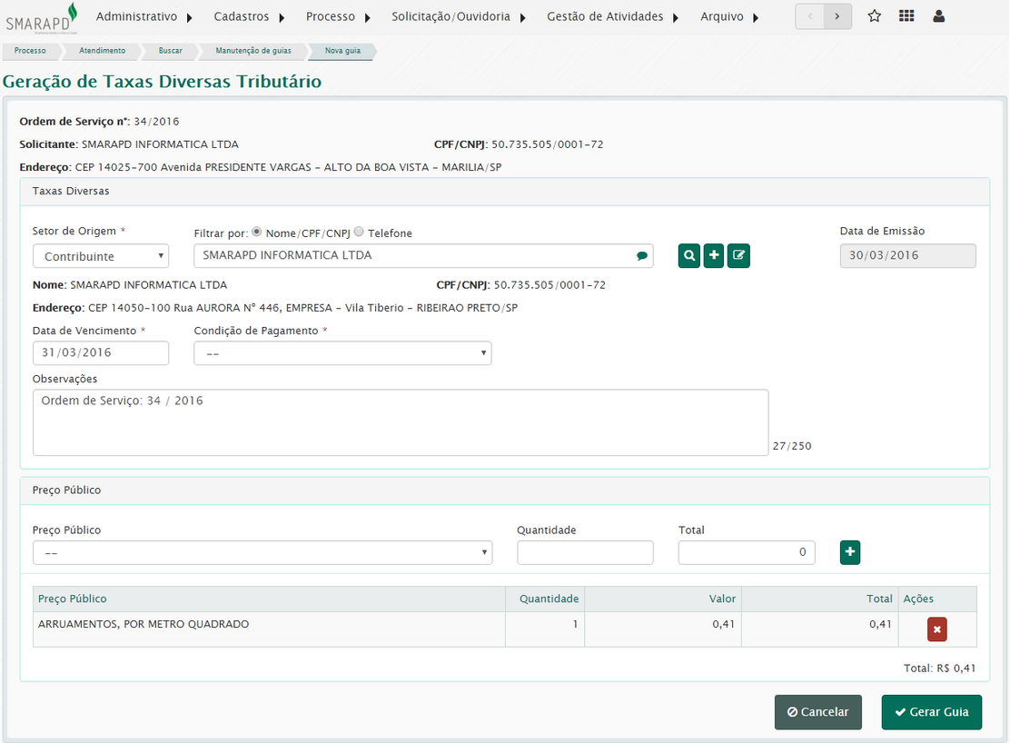 Para a geração de guias, lembre-se que o cadastro dos preços públicos e condições de pagamento são feitos de acordo com o sistema tributação.