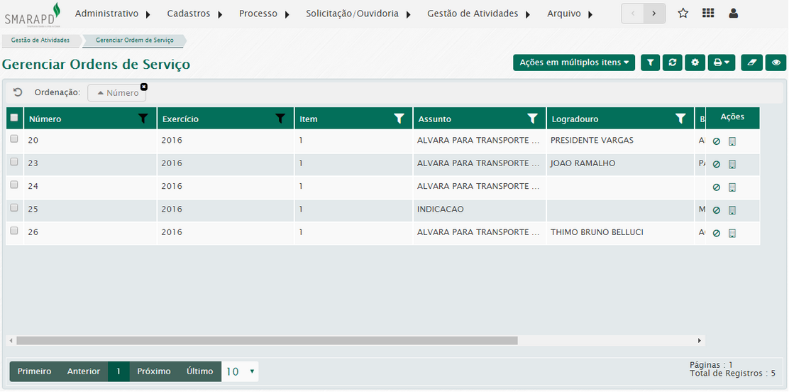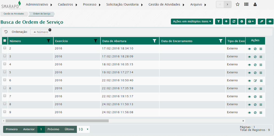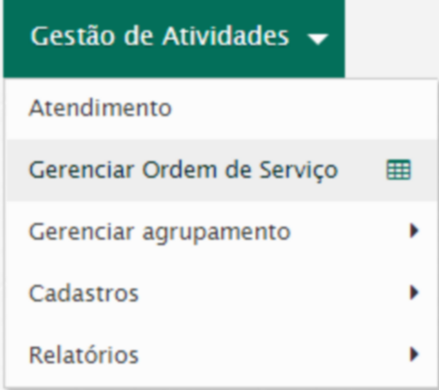 Para gerenciar as ordens de serviço, acesse o menu Gestão de atividades / Gerenciar ordem de serviço / Buscar