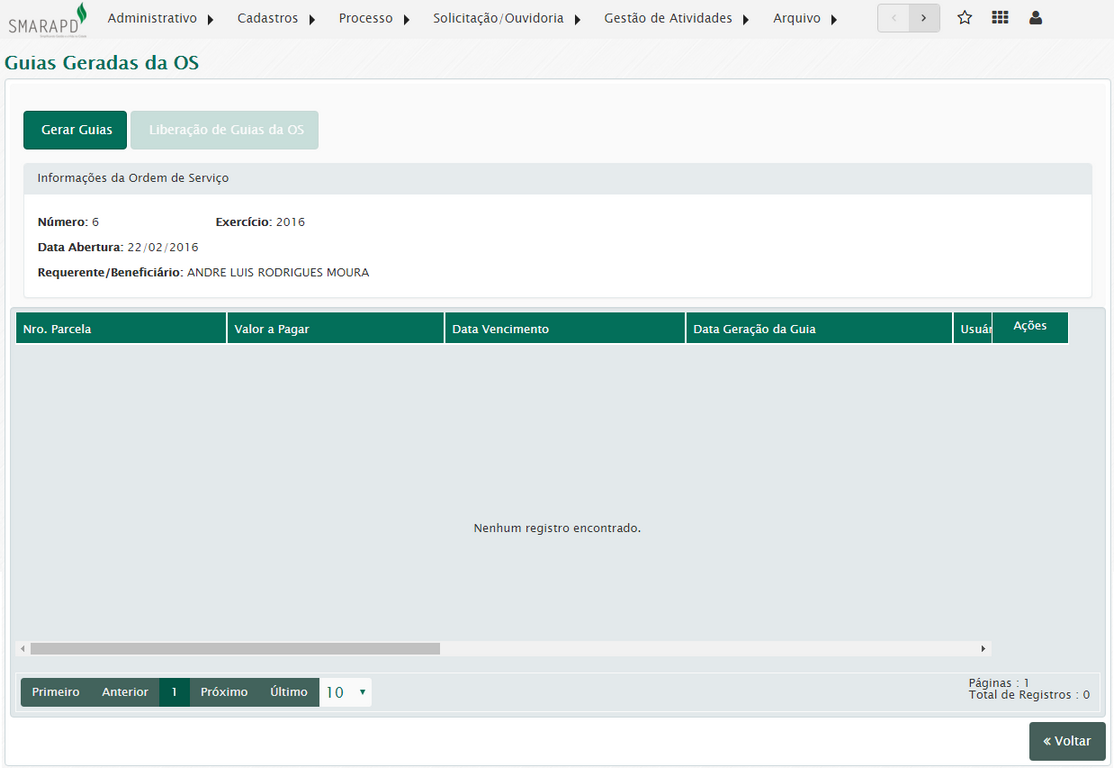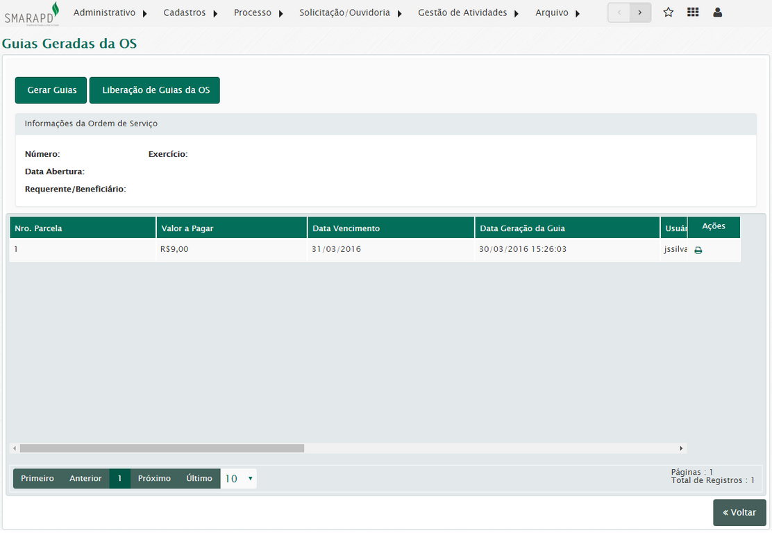 Aqui será possível a geração de guias para a ordem de serviço e reimpressão de guias geradas anteriormente.