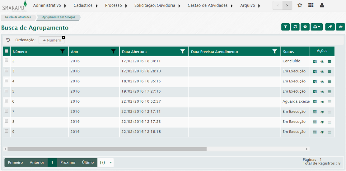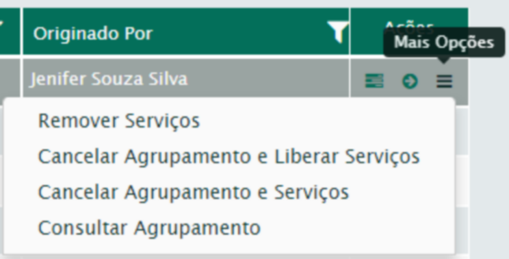 Através da coluna Ações você poderá listar os serviços do agrupamento, visualizar o agrupamento, cancelar o agrupamento e seus serviços, imprimir relatórios e realizar o apontamento do agrupamento.