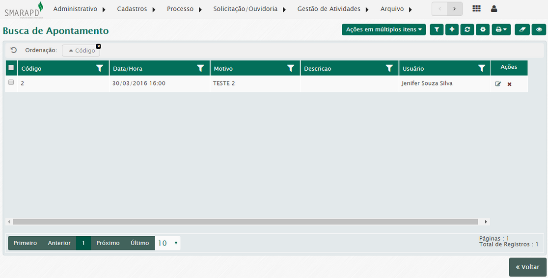 Primeiramente são exibidos em lista todos os apontamentos registrados para o agrupamento.