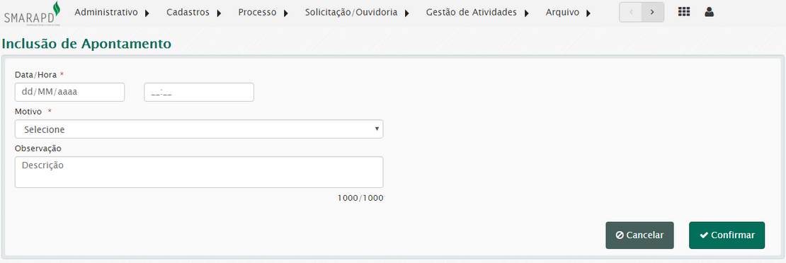 Insira as informações do apontamento. Tente ser o mais real possível nas informações aqui preenchidas. Se possível, preencha a observação do apontamento.