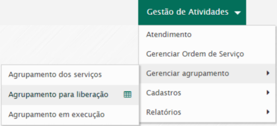 Para consultar os agrupamentos que aguardam liberação acesse o menu Gestão de atividades / Agrupamento para liberação.