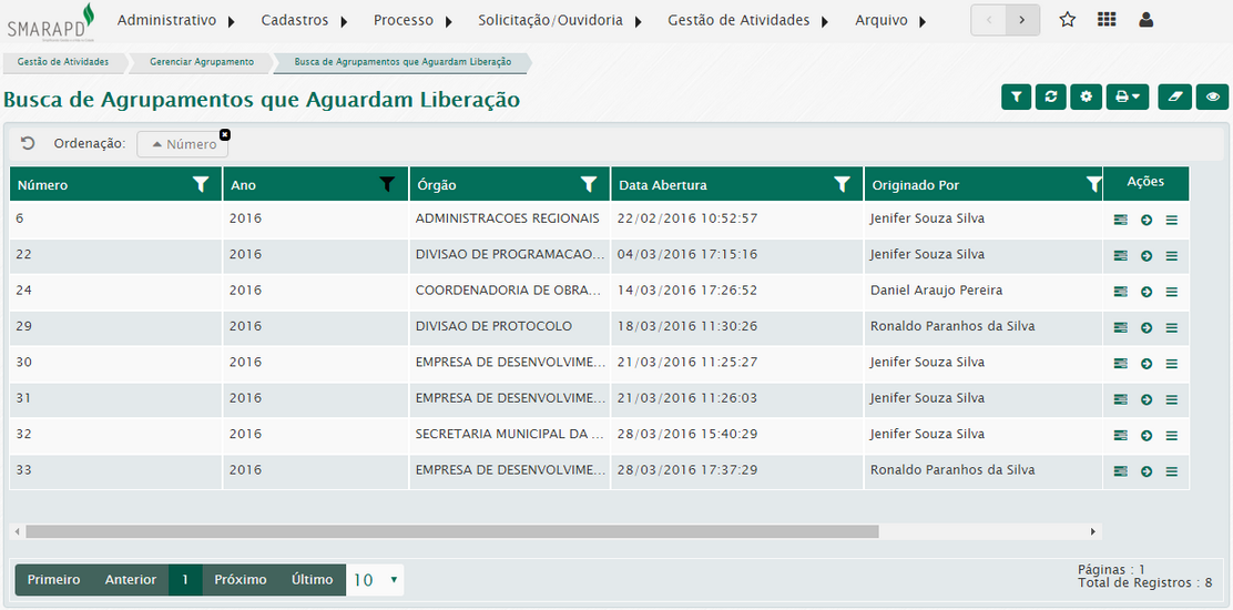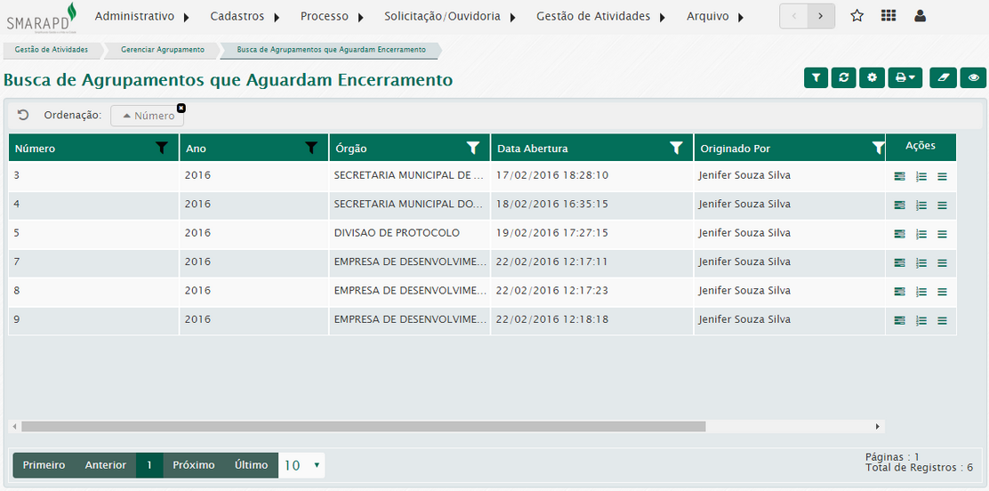 Aqui você poderá visualizar a lista de todos os agrupamentos gerados pelo sistema, independente de seu status.