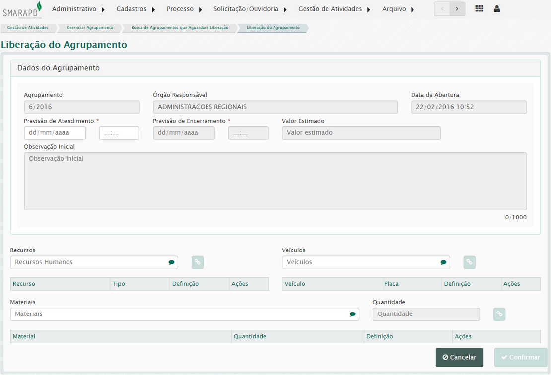 Na geração do agrupamento é necessário informar se o agrupamento será imediatamente liberado para execução ou não. Também é preciso informar o órgão responsável pela execução dos serviços.