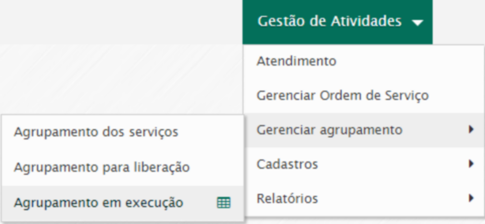 Para consultar os agrupamentos em execução acesse o menu Gestão de atividades / Agrupamento em execução.