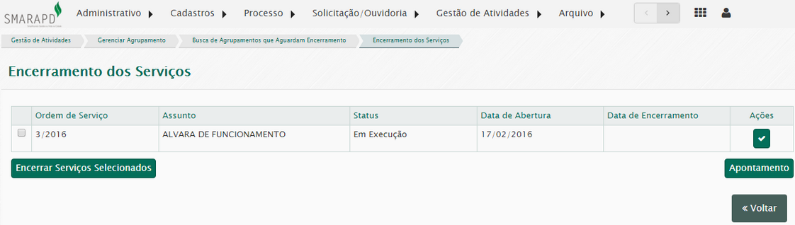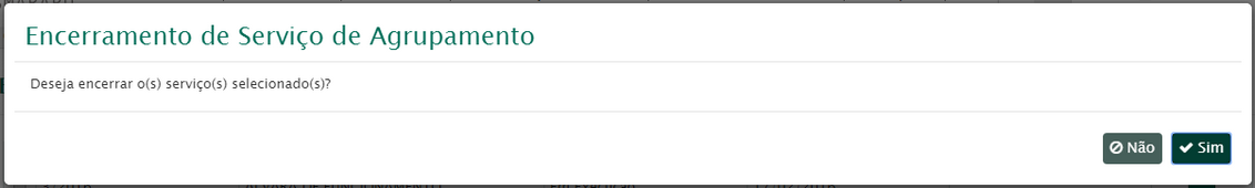 Primeiramente serão exibidos todos os serviços existentes no agrupamento. Aqui você poderá encerrar um ou vários serviços.