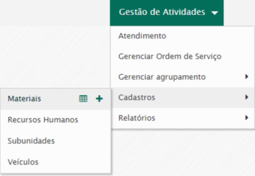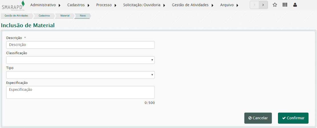 Esta funcionalidade permite cadastrar materiais que serão utilizados na execução dos serviços solicitados.
