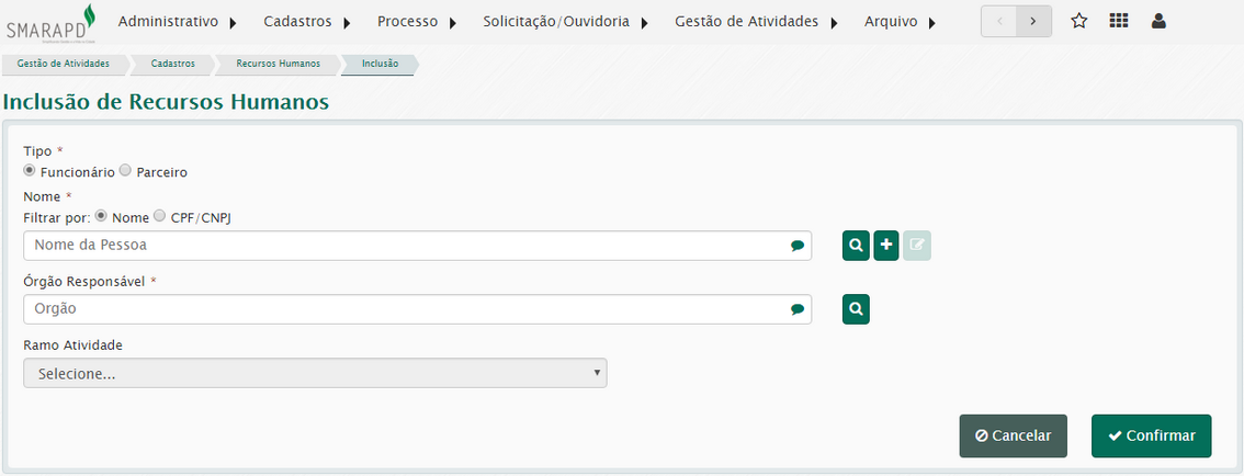 Para incluir um recurso humano acesse o menu Gestão de Atividades / Cadastros / Recursos Humanos / Novo.