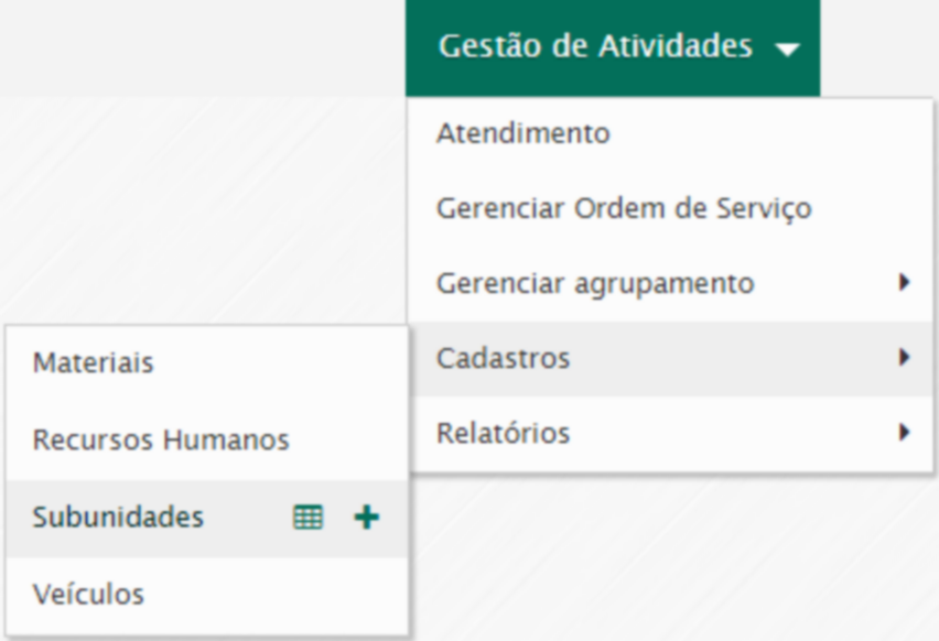 Para incluir uma subunidade acesse o menu Gestão de atividades / Cadastros / Subunidade / Novo.
