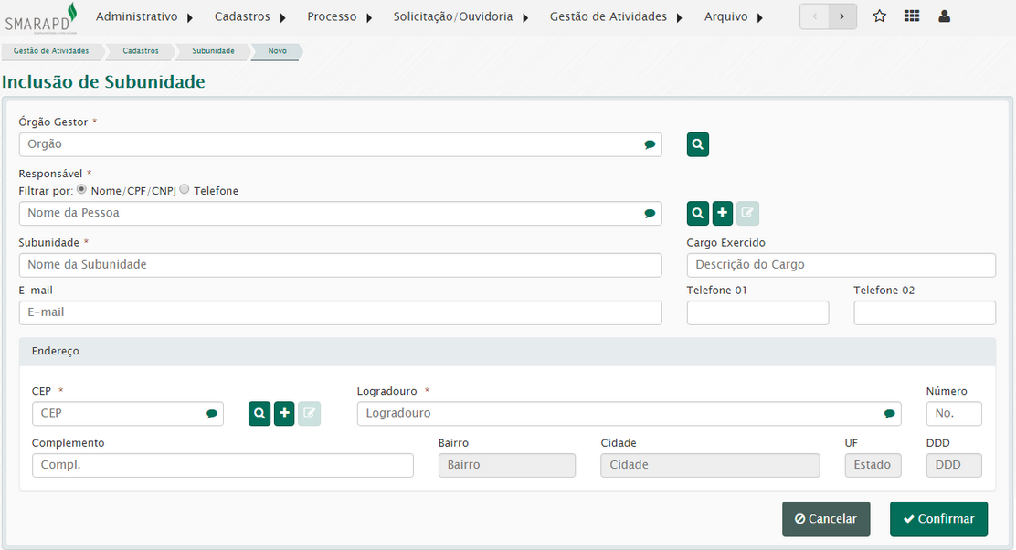 Esta funcionalidade permite cadastrar as subunidades dos órgãos administrativos.