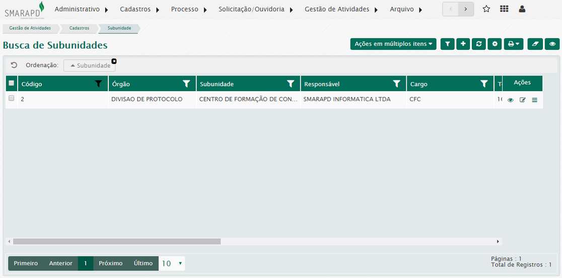 Na lista de subunidades, através da coluna Ações, você poderá visualizar editar, habilitar, desabilitar e excluir subunidades cadastradas no sistema.