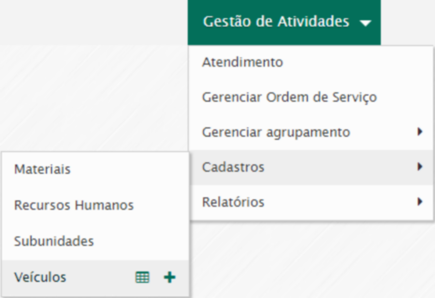 Para incluir um veículo acesse o menu Gestão de atividades / Cadastros / Veículos / Novo.