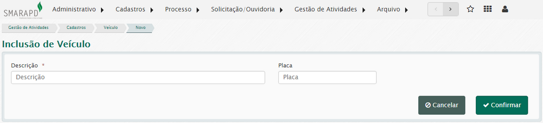 Esta funcionalidade permite cadastrar veículos que serão utilizados na execução dos serviços solicitados.