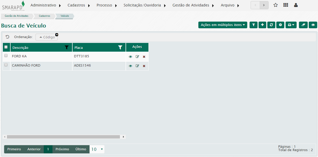 Para buscar um veículo acesse o menu Gestão de atividades / Cadastros / Veículos / Buscar.