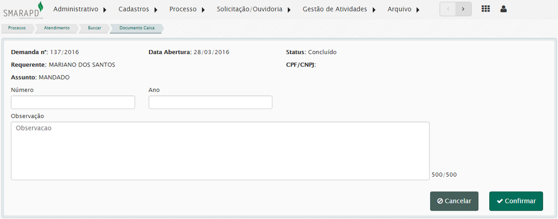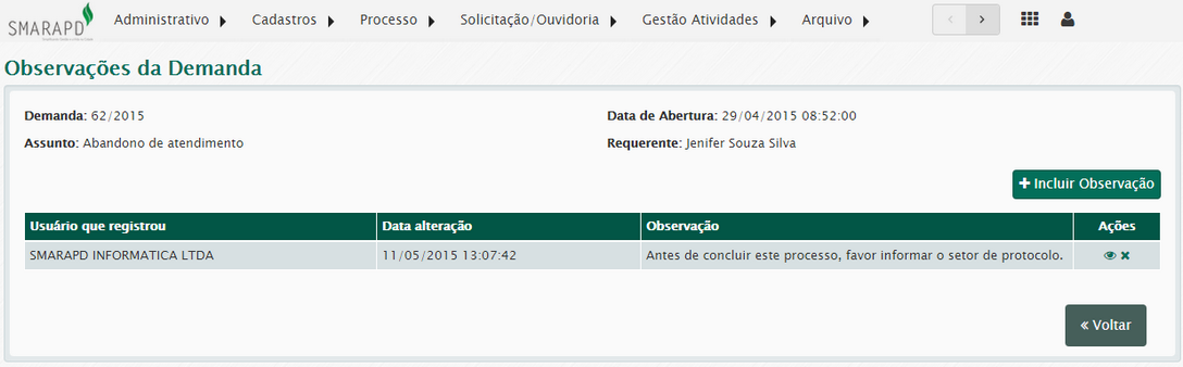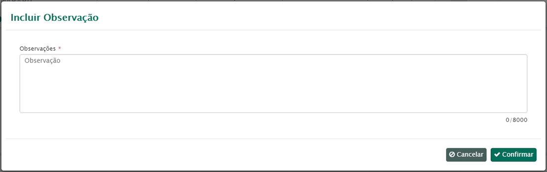 Aqui será possível a inclusão, visualização e exclusão de observações do processo.
