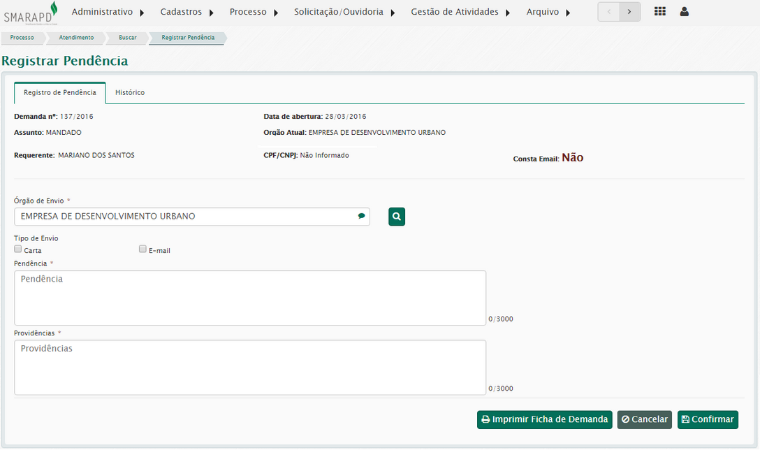 Aqui será possível o envio de aviso de pendências para o solicitante do processo.