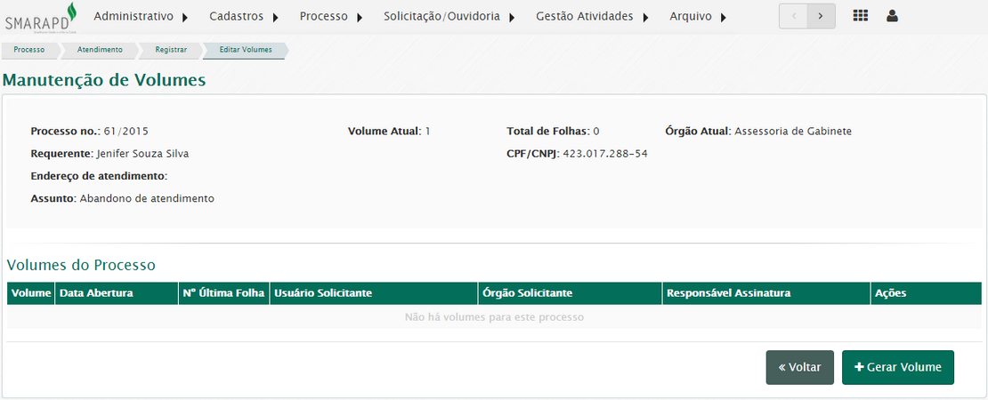 Permite a abertura de volumes para o processo, bem como a alteração de volumes já abertos.