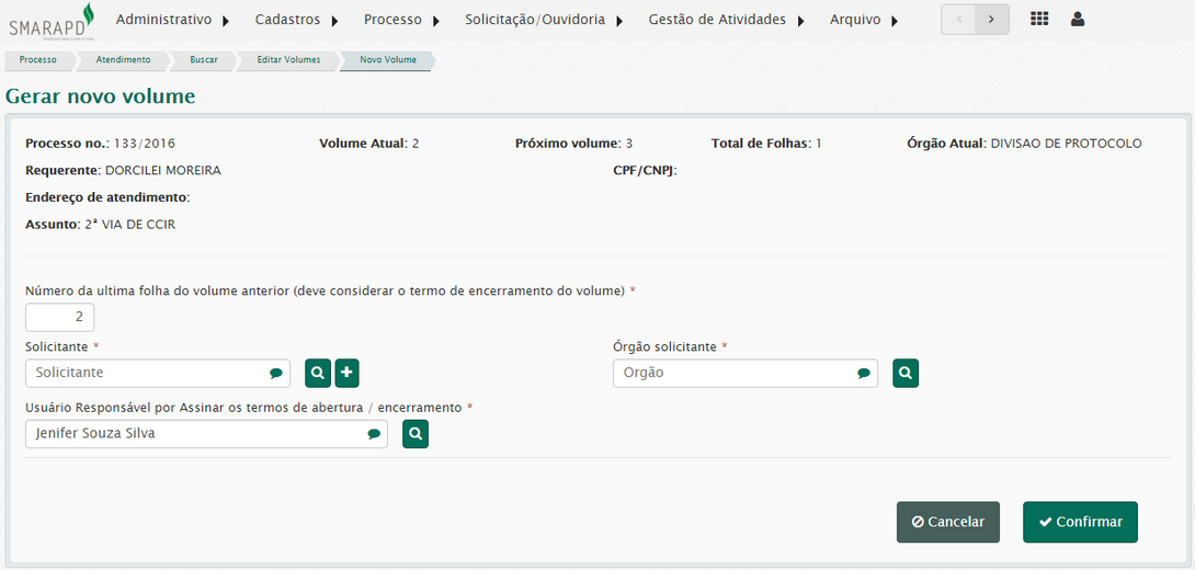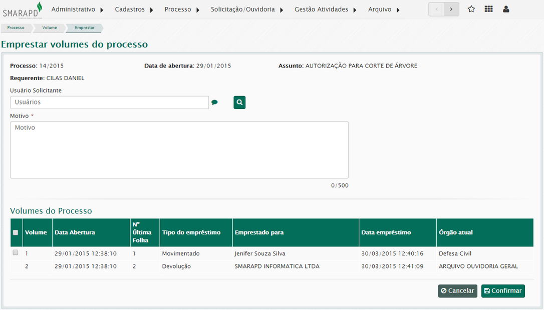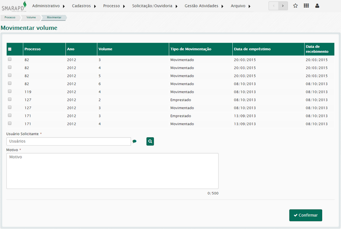 Uma vez pesquisado o processo, selecione o volume a ser emprestado e clique em Confirmar.