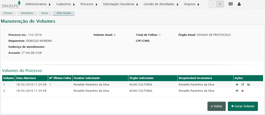 Uma vez gerado um volume você poderá excluí-lo, bem como alterar o número de folhas dos volumes anteriores.