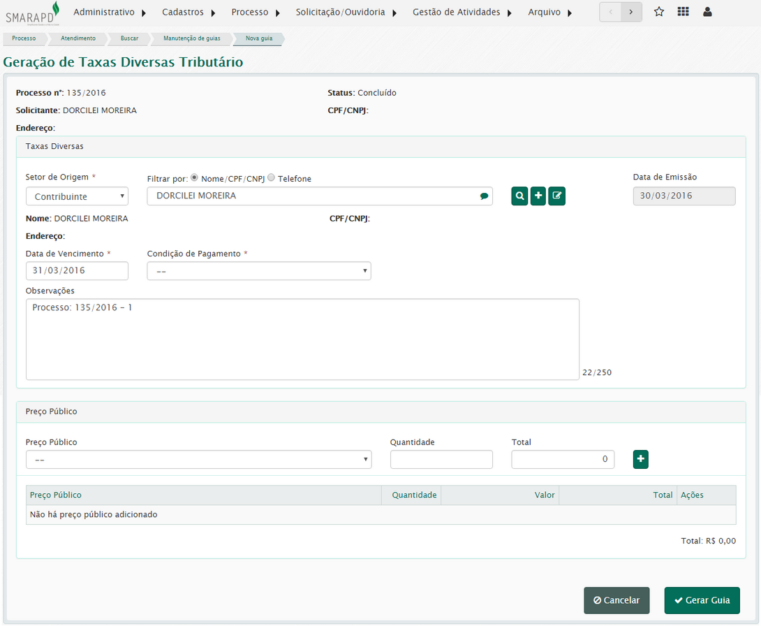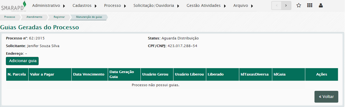 Aqui será possível a geração de guias para o processo e reimpressão de guias geradas anteriormente.