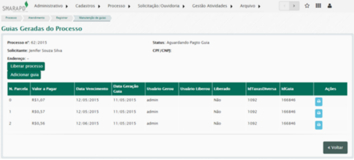 Após a geração da guia você poderá reimprimi-la ou liberar o processo para tramitação mesmo que a guia ainda não tenha sido paga.