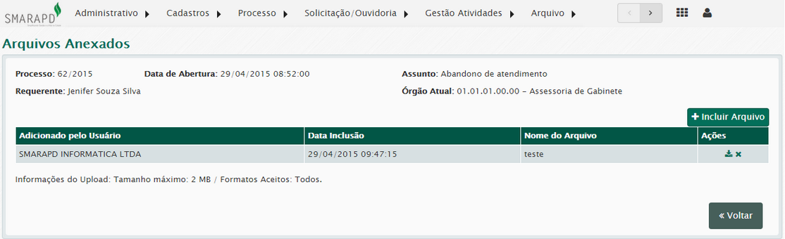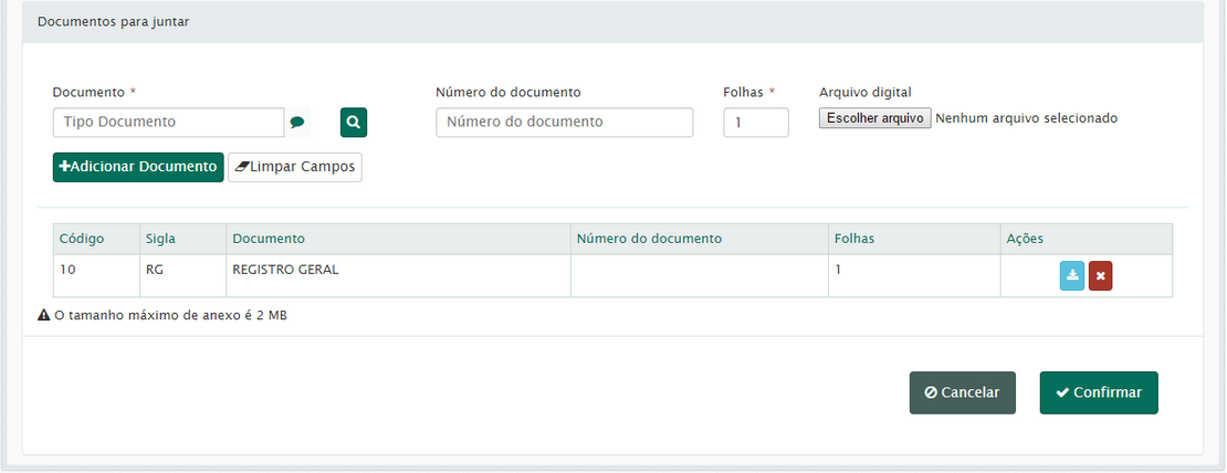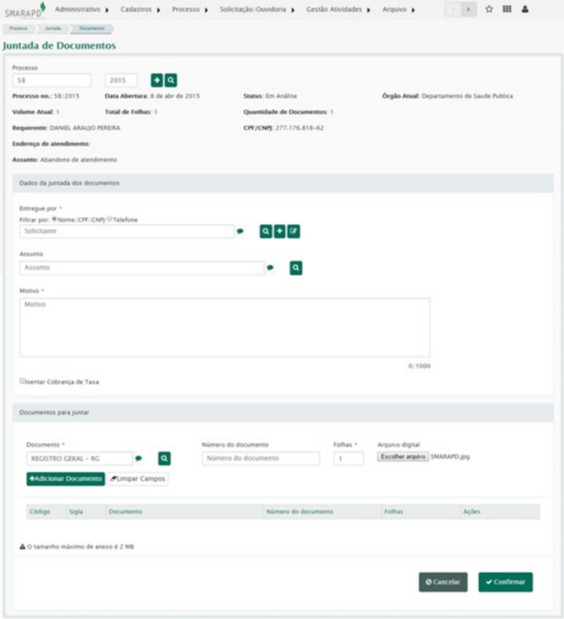 Permite a inclusão de arquivos digitais ao processo, como cópia digital de documentos do solicitante.