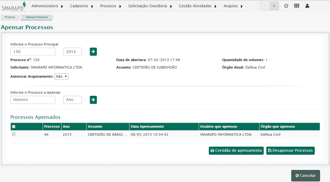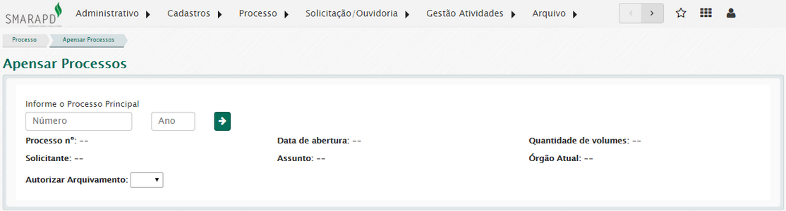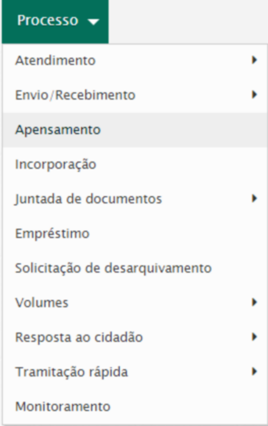 Para realizar o apensamento de processos acesse o menu Processo / Apensamento.