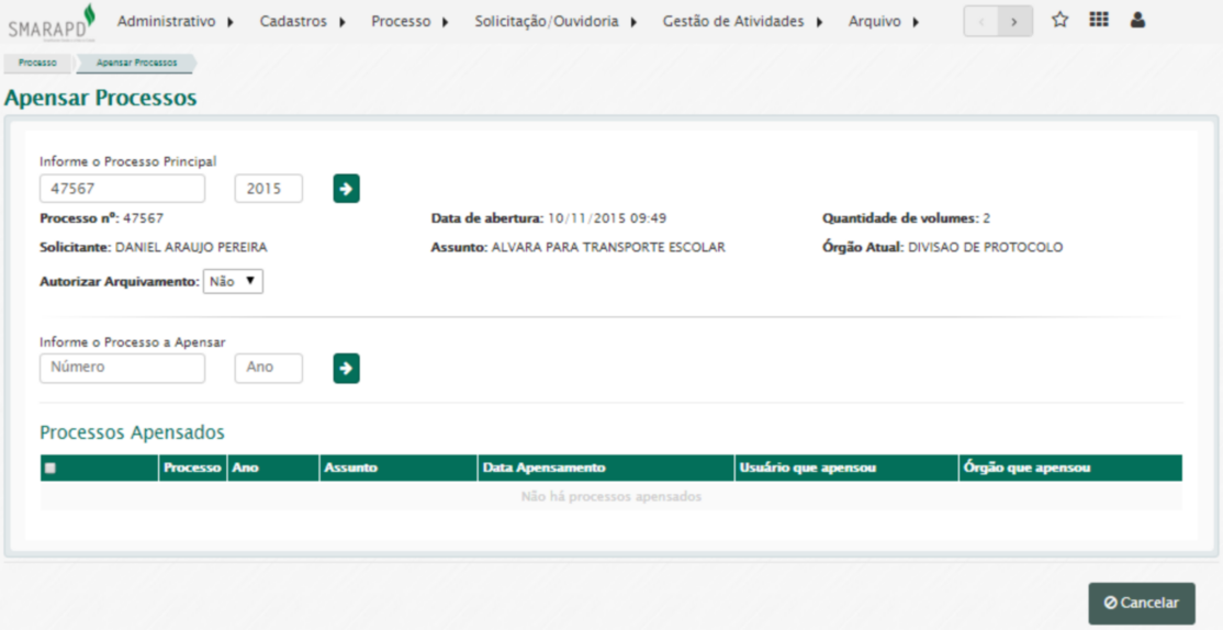 Após o preenchimento dos campos referentes ao processo a ser apensado a lista de processos apensados será atualizada.