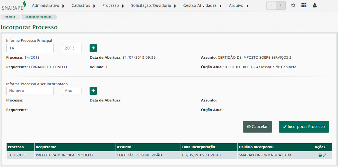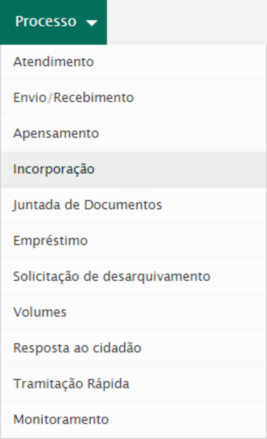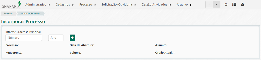 Para realizar a incorporação de processos acesse o menu Processo / Incorporação.