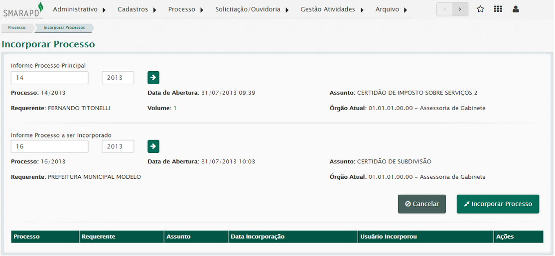 Após efetuar a incorporação será atualizada a lista de processos incorporados.