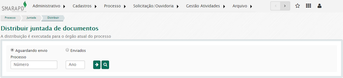 Após a distribuição da juntada, é necessário que o órgão atual do processo a receba. Para isso, acesse Processo / Juntada de documentos / Receber.