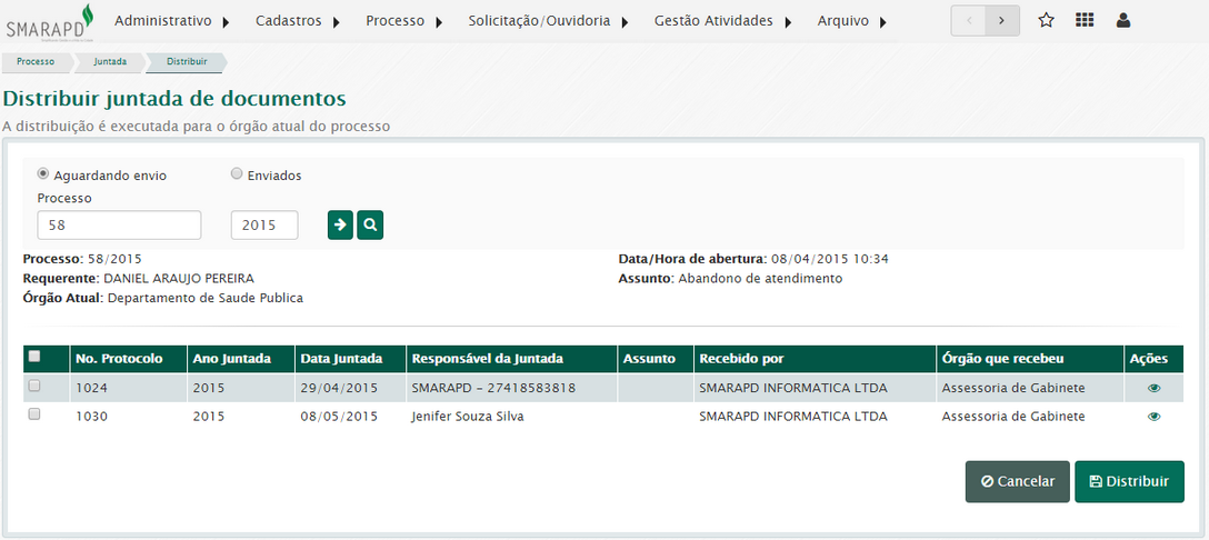 2)Após criar o(s) processo(s) o usuário deve fazer a remessa (distribuição), endereçando a um departamento em específico.