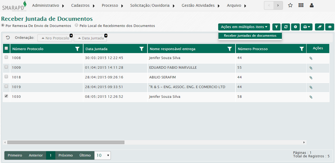 Após executar o filtro, selecione as juntadas a serem recebidas.