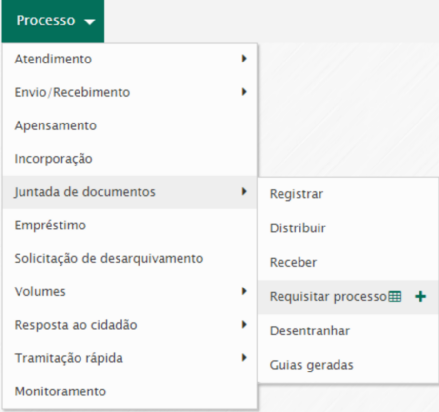 É possível requisitar um processo para que se faça a juntada de documentos. Isso poderá ser feito através do menu Processo / Juntada de Documentos / Requisitar Processo / Novo.