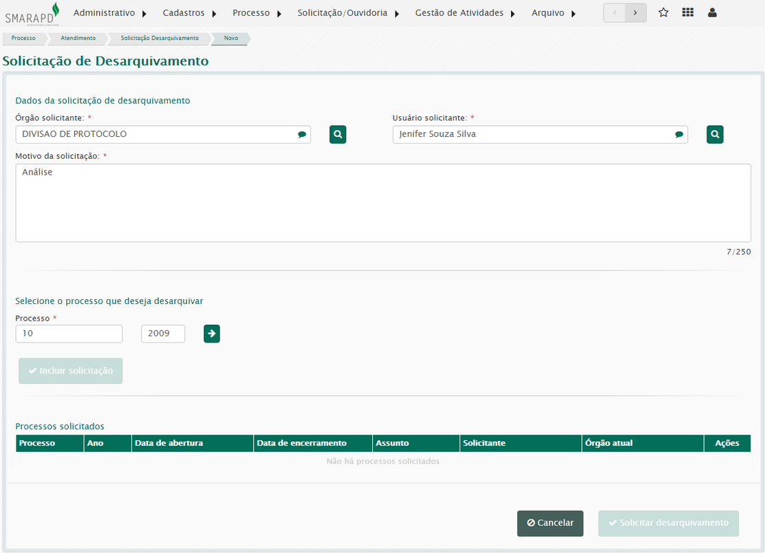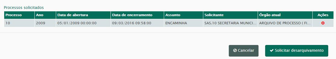 Os processos solicitados serão adicionados à lista na parte inferior da tela. Após adicionar todos os processos à lista clique em “Solicitar desarquivamento”.
