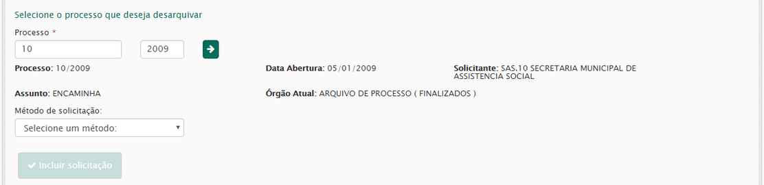 Serão exibidos os dados do processo. Confira-os com calma, selecione o método de solicitação e clique em “Incluir solicitação”.