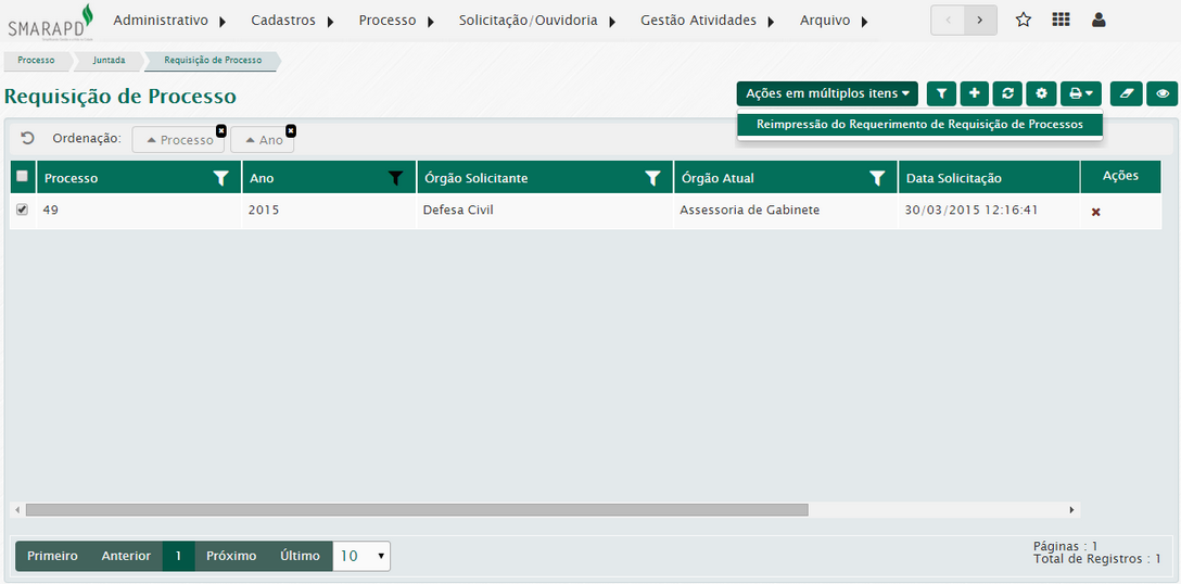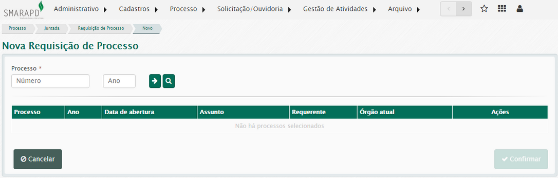 Para buscar as requisições de processos registradas no sistema acesse Processo / Juntada de documentos / Requisitar processo / Buscar.