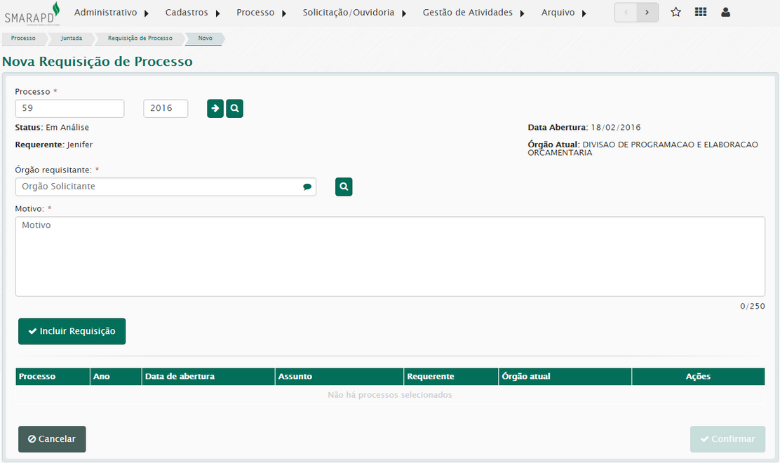 Nesta tela será possível buscar as requisições de processos registradas no sistema, bem como excluí-las e efetuar novas, se necessário.