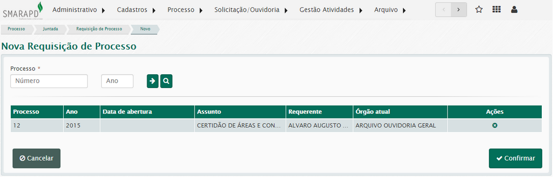 Primeiramente preencha o número e ano do processo a ser requisitado e clique em Buscar.