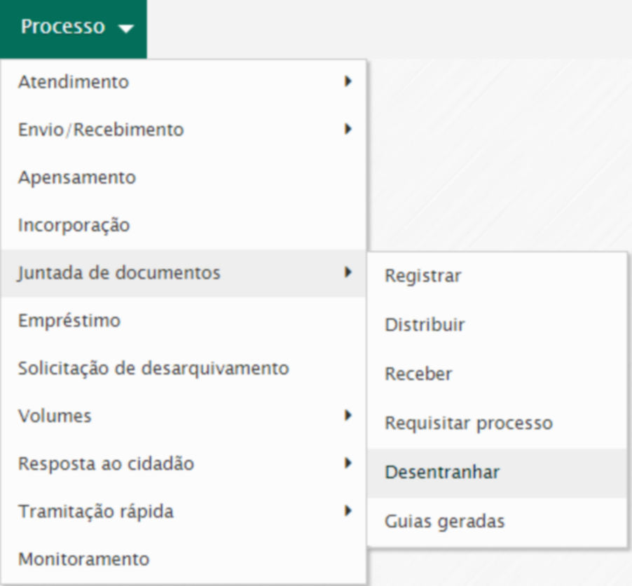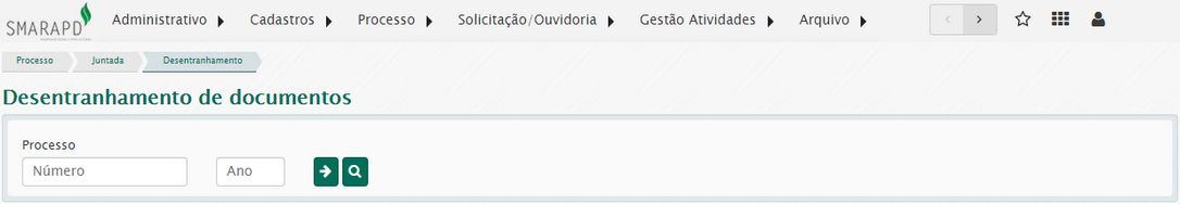 Uma vez feita à juntada, para desfazê-la acesse Processo / Juntada de documentos / Desentranhar.
